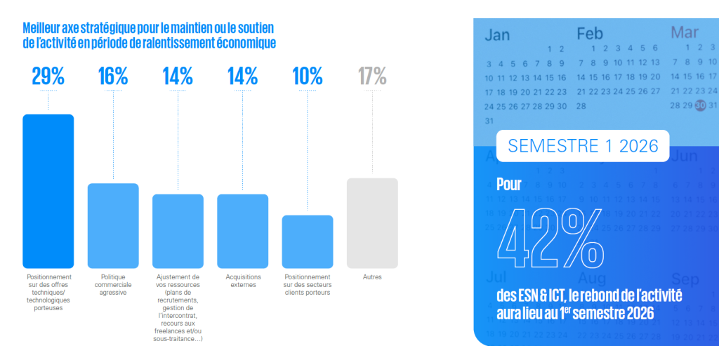 Histoire de ne pas sombrer dans un défaitisme immobilisateur, 42% des ESN et ICT interrogées espèrent et même anticipent un véritable rebond d’activité au premier semestre 2026.