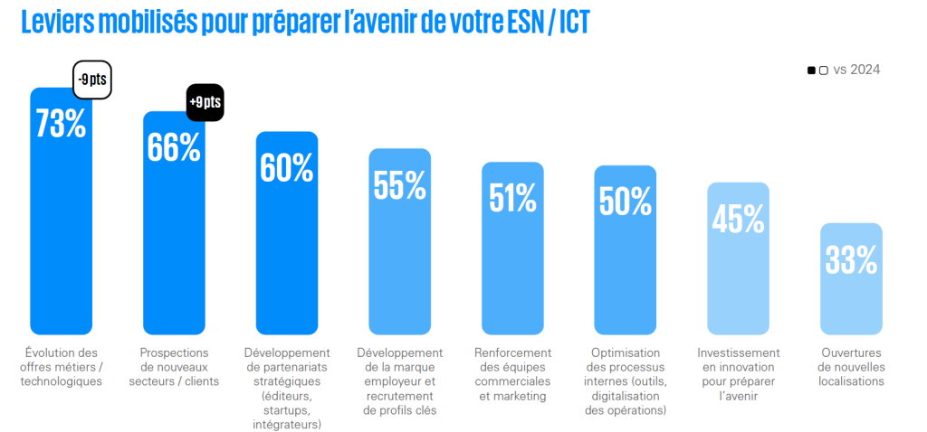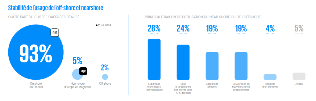 Face à ces vents contraires, le secteur refuse l’immobilisme et opère un changement stratégique fondamental en abandonnant progressivement un modèle centré sur le volume de prestations pour privilégier la création de valeur. Cette transformation se manifeste par une réorientation vers des offres technologiques innovantes pour 29% des entreprises et par le développement massif de partenariats stratégiques, une voie choisie par 60% des acteurs du marché. Et, dans les faits, l’onshore reste ultra-majoritaire (93 % du chiffre d’affaires), l’« hybridation » nearshore/offshore étant mobilisée au cas par cas pour des raisons d’expertise et de coûts.