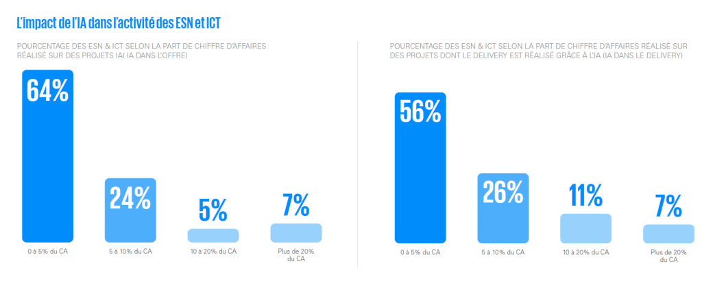 Néanmoins, côté business, la contribution de l’IA aux revenus progresse mais reste encore concentrée : 64 % des entreprises déclarent moins de 5 % de chiffre d’affaires réalisé sur des projets intégrant l’IA dans l’offre, et 56 % moins de 5 % quand l’IA est utilisée dans le delivery.