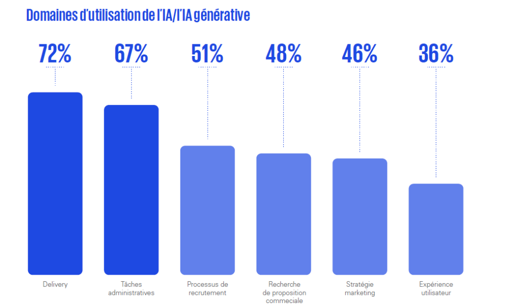 Pour les ESN & ICT, en 2025, l’IA n’est déjà plus un pari, mais un levier d’exécution. L’étude montre que 72 % des entreprises l’emploient dans leur delivery, 67 % dans les tâches administratives, 51% dans leurs recrutements. Mais elle irrigue aussi le marketing et l’expérience utilisateur.