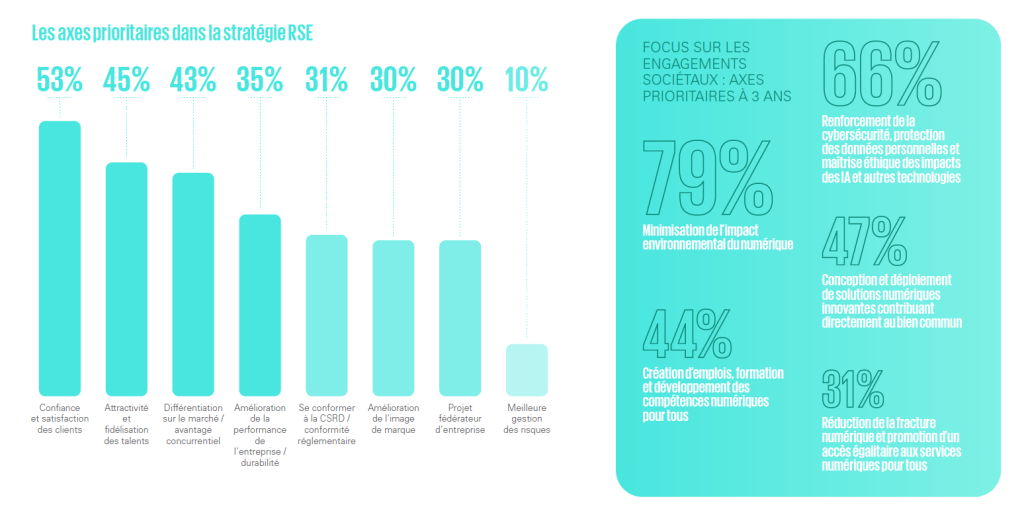En cas de reprise d’activité, les investissements RSE se concentreraient d’abord sur le numérique durable (Green IT et sobriété) devant les volets éthique et confiance (cybersécurité, protection des données, IA responsable) avouent les différents acteurs interrogés.