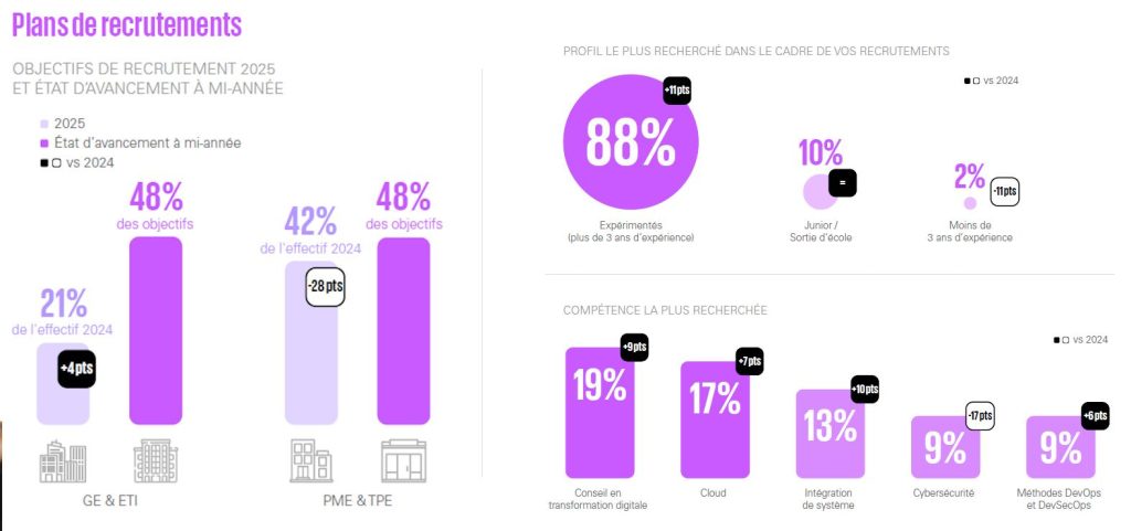Cela reste significativement inférieur à la moyenne, preuve qu’une majorité des entreprises du numérique affichent une certaine prudence qui s’explique par des risques identifiés comme critique : la conjoncture globale inquiète 85% des répondants, la faiblesse persistante de la demande client en préoccupe 67%, tandis que le manque de ressources et de compétences reste un frein pour 33% d’entre elles.