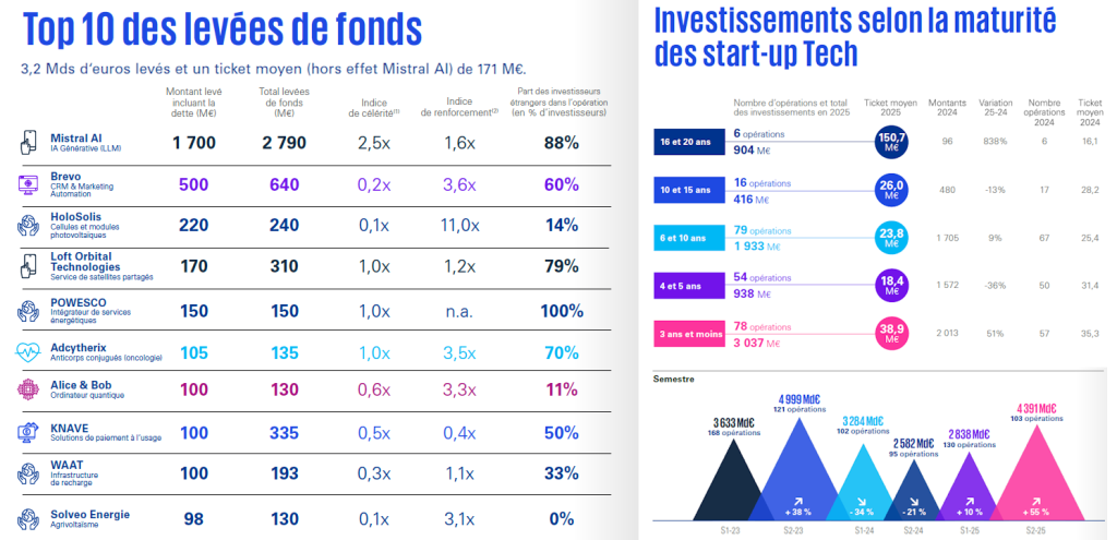 Le problème, c’est que la colossale levée de fonds de Mistral AI agit comme un trompe-l’œil. Ainsi, sur le segment des startups de moins de 3 ans, la hausse des montants atteint +51 %… mais, si on retire l’opération exceptionnelle de Mistral AI de l’équation, la dynamique du segment recule de 51 % par rapport à 2024 !