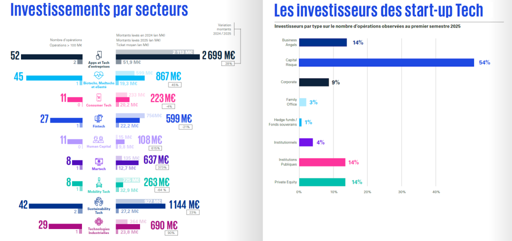 Côté hiérarchie sectorielle, les « Apps & Techs d’entreprises » captent 37 % des montants investis, soit 2,7 milliards d’euros, en hausse de +28 %. L’essor de l’IA générative et de l’IA agentique y joue un rôle moteur, en tirant des plateformes orientées productivité, automatisation, relation client ou cybersécurité.