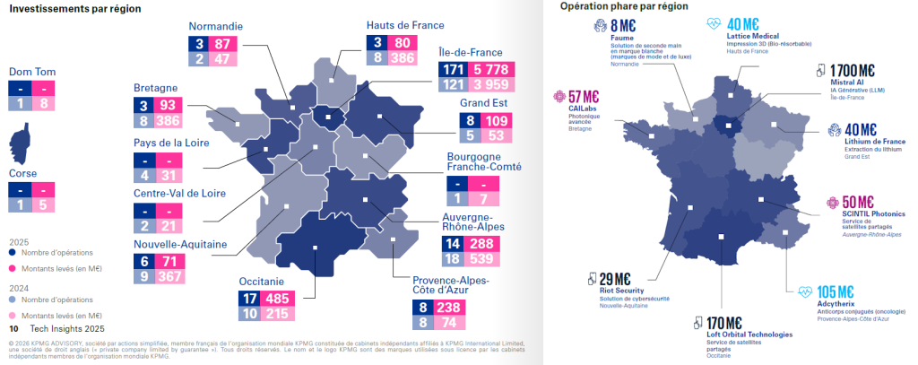 Côté territoires, 2025 confirme une forte concentration. L’Île-de-France capte 5,8 milliards d’euros sur 171 opérations, en hausse de +46 % en valeur. En parallèle, certaines régions affichent une accélération notable : tirée par le spatial, l’Occitanie atteint 485 M€ (progression annoncée de plus de 126 %, portée notamment par Loft Orbital Technologies et sa levée de 170 M€), tandis que la région PACA atteint 238 M€ et affiche une progression de plus de 222 %, portée par les BioTech et la santé (notamment via la levée d’Adcytherix à 105 M€).