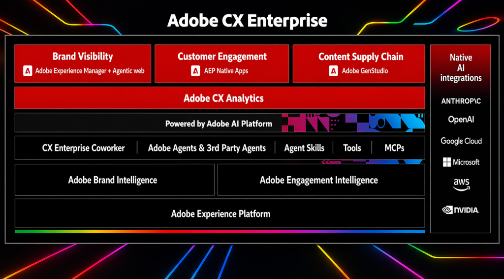 Adobe insiste fortement sur l’ouverture. CX Enterprise doit fonctionner avec des standards comme MCP et Agent-to-Agent, et s’intégrer avec des environnements comme Microsoft 365 Copilot, ChatGPT Enterprise, Claude Enterprise, Gemini Enterprise, IBM watsonx Orchestrate ou les services d’AWS, Google Cloud, NVIDIA et OpenAI.