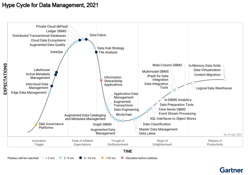 Face à cette demande des entreprises, de nouvelles architectures sont en train de monter en puissance. Le Hype Cycle du Gartner consacrait le modèle data fabric au sommet de la vague en 2021. Dans ce modèle, l’entreprise doit se doter d’un framework agnostique en termes de technologie, que ce soit avec le data warehouse « legacy », la brique big data, mais aussi des solutions « cloud native » de nouvelle génération. Selon les analystes de Gartner, ce modèle data fabric laisse espérer un accroissement de l’utilisation des données dans l’entreprise d’un facteur quatre, notamment en réduisant les tâches de manipulation de données manuelles de moitié.