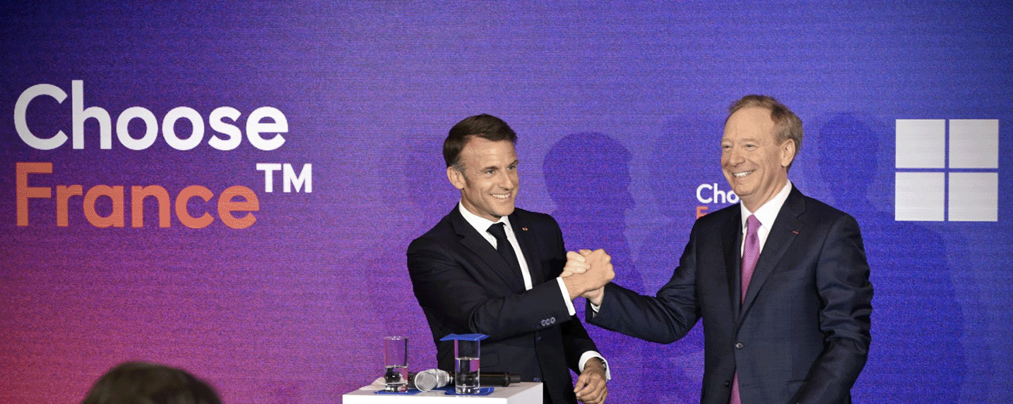 Choose France 2024 : Emmanuel Macron et Brad Smith, président de Microsoft, lors de l'annonce de l'investissement de quatre milliards d'euros par Microsoft.