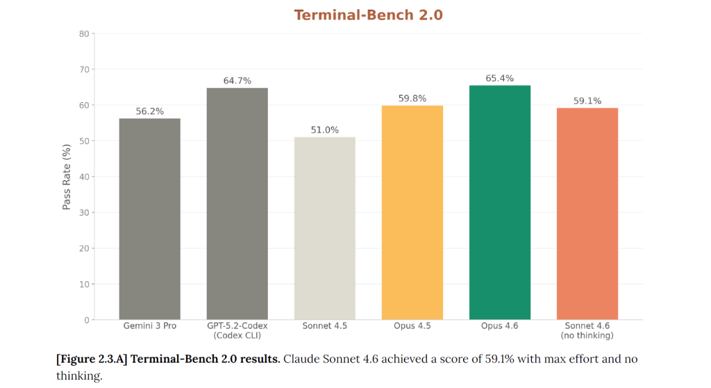 Côté performance, les chiffres publiés par Anthropic sont plutôt éloquents. Sur SWE-bench Verified, désormais devenu le benchmark de référence pour l’ingénierie logicielle, Sonnet 4.6 atteint 79,6 %, à peine 1,2 point derrière Opus 4.6 (80,8 %) et nettement au-dessus de son prédécesseur Sonnet 4.5 (77,2 %).