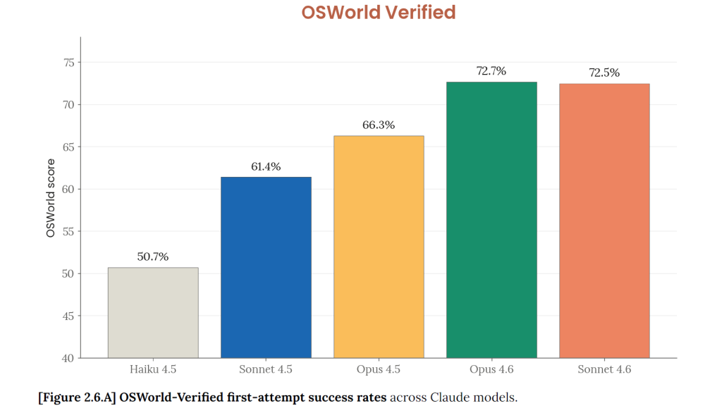 Sur OSWorld-Verified, qui mesure la capacité d’un modèle à utiliser un ordinateur de façon autonome (cliquer, naviguer, remplir des formulaires), le score de Sonnet 4.6 atteint 72,5 %, quasiment au niveau d’Opus (72,7 %) et très loin devant GPT-5.2 d’OpenAI (38,2 %). La progression est spectaculaire : en octobre 2024, le premier Sonnet capable d’utiliser un ordinateur ne dépassait pas 14,9 % sur ce même benchmark. Le score a donc presque quintuplé en seize mois (néanmoins le benchmark a évolué durant cette période ce qui fausse un peu les comparaisons).