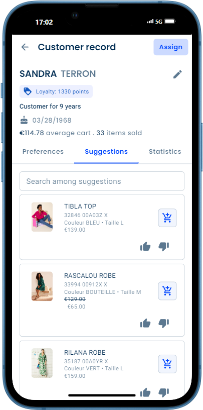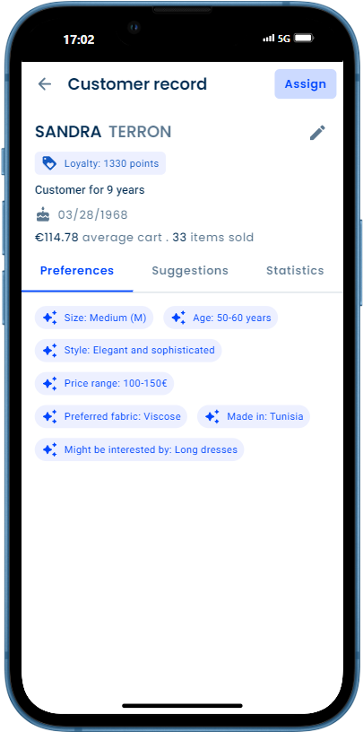 Pour les clients disposant d’une carte de fidélité, et donc identifiables par le commerçant, Pulse apporte au vendeur la possibilité de nouer une relation plus personnalisée, grâce à sa connaissance dudit client. Le logiciel analyse les données disponibles sur lui (historique d’achats, préférences de taille, de couleurs, etc.) et les synthétise immédiatement à travers un système de mots clés qui permettent au vendeur de disposer, en un coup d’œil, d’une meilleure compréhension du profil et des préférences du client. Il peut ainsi mieux personnaliser ses conseils.