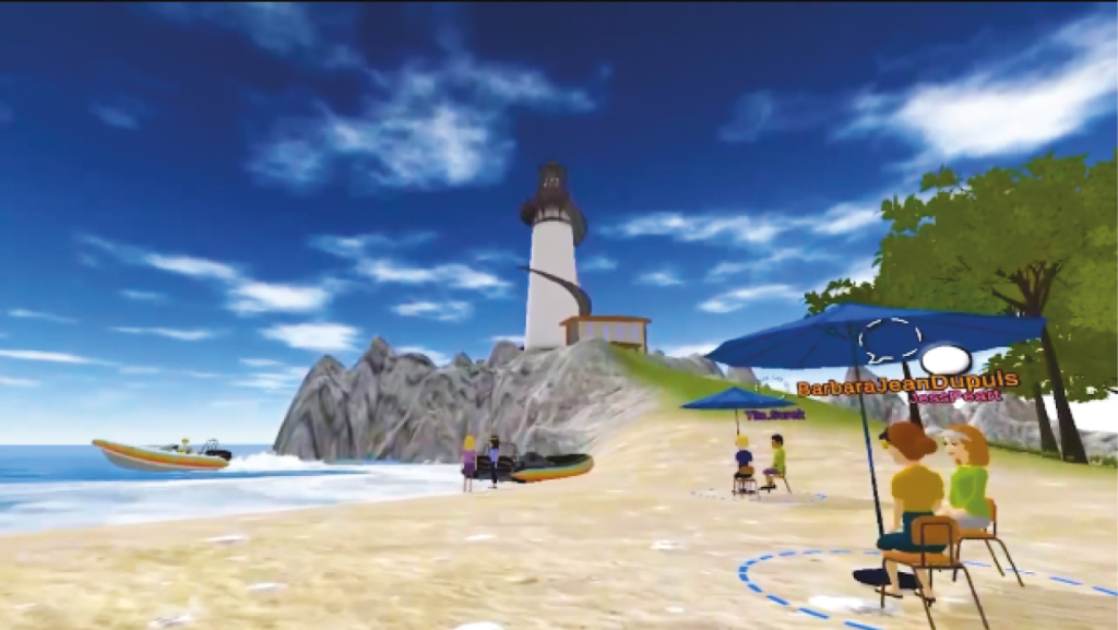 À côté des environnements de travail, les métavers peuvent offrir des espaces pour des activités favorables à la cohésion d’équipe. Comme faire du Speed-Boat, dans Virbela.