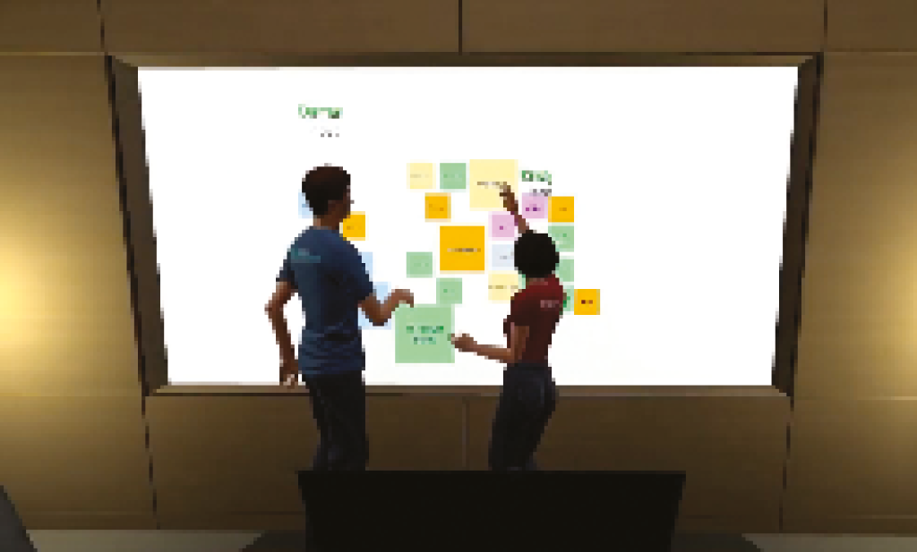 Comme dans toute réunion physique, le tableau blanc ou noir et les post-it constituent les outils de base pour collaborer dans le métavers (ici dans l’environnement Engage).