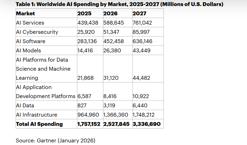 Selon le dernier rapport Gartner, la dépense mondiale IA devrait atteindre près de 2 528 Milliards de dollars en 2026, soit une progression de 44 % sur un an. Et Gartner voit déjà la trajectoire toujours aussi ascendante en 2027 et anticipe les dépenses de l’an prochain à plus de 3 336 Milliards de dollars !
