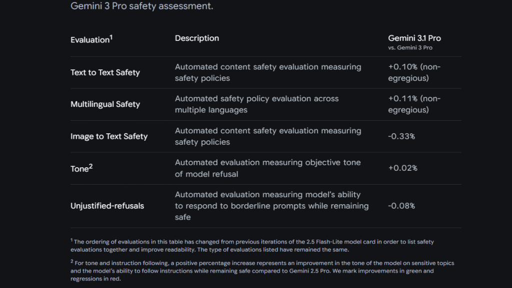 Sur le premier volet, les résultats sont présentés en delta par rapport à Gemini 3 Pro. Les variations sont minimes : +0,10 % en sécurité texte-vers-texte, +0,11 % en sécurité multilingue, –0,33 % en sécurité image-vers-texte. Google précise avoir vérifié manuellement que les régressions étaient soit des faux positifs, soit des contenus non dangereux. La tonalité des refus s’améliore marginalement (+0,02 %) et les refus injustifiés restent quasiment stables (–0,08 %).