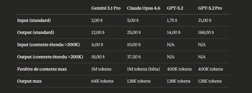En parlant de coûts justement, Gemini 3.1 Pro est facturé comme Gemini 3 Pro : 2 dollars par million de tokens en entrée et 12$ par million de tokens en sortie.