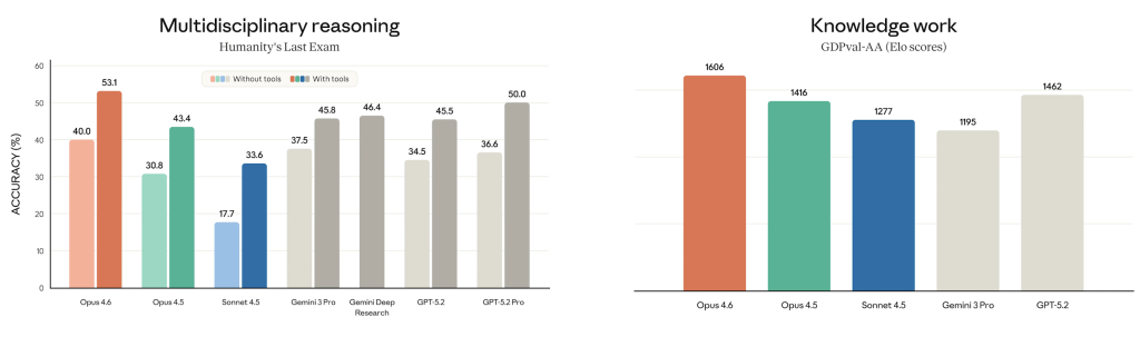 Opus 4.6 affiche de son côté une domination sur les évaluations de travail professionnel à haute valeur ajoutée. Sur GDPval-AA, un benchmark indépendant d’Artificial Analysis qui évalue la performance sur 220 tâches professionnelles réelles couvrant 44 métiers dans 9 secteurs, Opus 4.6 devance GPT-5.2 d’environ 144 points Elo, soit un taux de victoire d’environ 70 % en comparaison directe. Sur Humanity’s Last Exam, un benchmark multidisciplinaire décrit comme étant « à la frontière de la connaissance humaine », Opus 4.6 établit un nouveau record avec des outils de recherche activés, dépassant tous les autres modèles testés. Même constat sur BrowseComp, l’évaluation de recherche web complexe d’OpenAI, où Opus 4.6 atteint l’état de l’art, avec un score de 84 % en configuration single-agent (86,8 % en multi-agent). Sur DeepSearchQA, il obtient un F1 de 91,3 % en configuration single-agent (92,5 % en multi-agent). Bref Opus 4.6 se veut plus polyvalent. Il devient d’ailleurs le nouveau moteur de l’environnement agentique « Cowork » d’Anthropic (une sorte de Claude Code, mais pour tous)