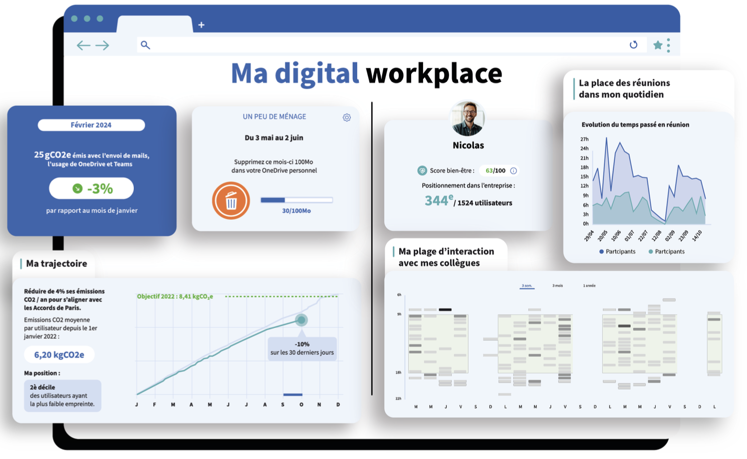 Elle a été co-conçue avec quatre entreprises : L’Oréal, Accor, Swiss Life et Technip Energies. Sa force est de pouvoir analyser finement les usages quotidiens des outils de Microsoft 365 et de Google Workspace. Sa technologie analytics récupère les données brutes des activités (envoi d’e-mails, partage de fichiers, organisation de visioconférences, discussions par tchat, etc.) afin de fournir des indicateurs sur l’impact carbone et le rythme de travail des collaborateurs (volume de réunions, activité en débordement, multitâches), ainsi que sur la maturité de leurs pratiques collaboratives. Forte de ces informations, l’application permet de lancer des défis afin de mobiliser les collaborateurs dans la transformation de leurs pratiques de travail.