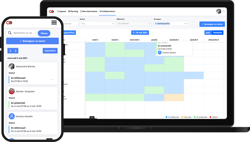 Desk.ly, Coworklib, Jooxter, Flydesk… Avec le mode de travail hybride, de nouveaux acteurs apparaissent pour gérer l’espace de travail. Leurs solutions disposent de fonctions de réservation de poste, salle de réunion, parfois parking, généralement via une carte. Dans Jouxter, celle-ci affiche aussi les collègues qui seront présents et on peut effectuer une recherche en filtrant par lieu de travail. Un manager, par exemple, peut ainsi visualiser la présence de son équipe et trouver le meilleur moment pour organiser une réunion. Ces solutions proposent aussi une fonction d’agenda collaboratif, permettant de planifier sa présence au bureau selon celle de ses collègues ou des personnes pertinentes à rencontrer. Enfin, certaines, comme Flydesk, fournissent des métriques sur les habitudes de travail, pour aider une équipe à mieux comprendre comment elle travaille. Jouxter, lui, dispose aussi d’une offre avec capteurs de présence, pour connaître le taux d’occupation et les périodes affluence.