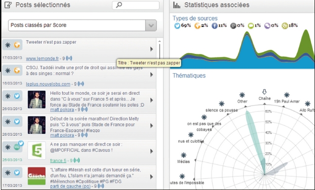 Avec Linkfluence, le groupe audiovisuel effectue trois autres nouveaux types de veille, à commencer par un système d’alerte. Un dirigeant se retrouve critiqué sur le Web ? Une émission suscite un nombre anormalement élevé de commentaires sur sa page Facebook ? Le système envoie alors un SMS ou un courriel à Myriam L’Aouffir qui, en fonction de l’ampleur de l’événement, relaye en interne ou surveille de près l’évolution des conversations.