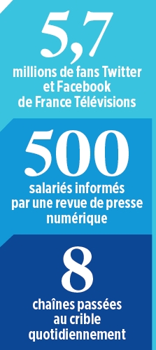 Veille active. Autre public intéressé par cette veille : les personnels de France Télévisions collaborant aux émissions, notamment les responsables et conseillers des programmes. Ils sont près de 500 à recevoir quotidiennement une revue de presse numérique sociale, mettant en exergue les grandes thématiques ayant suscité des réactions sur les réseaux sociaux.