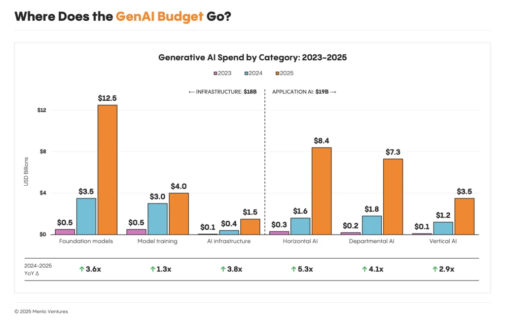 La structure de la dépense IA (ces 37 milliards de dollars évoqués plus haut) est instructive. Un peu plus de la moitié (19 milliards) va aux applications visibles par les utilisateurs – copilotes, assistants métiers, outils de coding – le reste allant aux briques modèles, data, infrastructure et observabilité.
