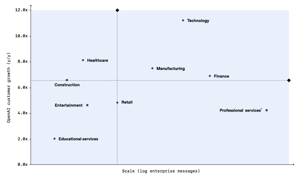 La première conclusion, quantitative, est simple : l’adoption s’accélère et s’approfondit. En un an, le volume de messages hebdomadaires dans ChatGPT Enterprise a été multiplié par huit, et le salarié moyen envoie environ 30 % de messages en plus qu’un an auparavant.