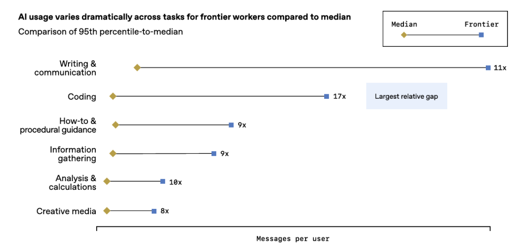 Toutefois, l’élément le plus éclairant de cette étude pour un DSI est que l’écart se creuse entre les “frontier workers” et le reste. Les 5 % d’utilisateurs les plus avancés envoient six fois plus de messages aux IA que la médiane, et les “frontier firms” (les entreprises qui explorent le potentiel de l’IA avant les autres) affichent deux fois plus de messages par siège, avec des intégrations plus profondes à travers les équipes.