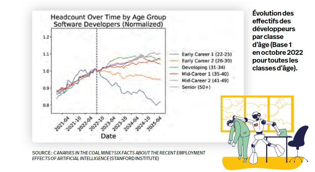 L’IA modifie également les critères de recrutement. À contre-courant du jeunisme souvent reproché au secteur IT, des chercheurs de Stanford ont ainsi montré que l’emploi des jeunes développeurs (22-25 ans) a diminué aux États-Unis de près de 20 % entre son pic fin 2022 – lancement de ChatGPT – et juillet 2025, tandis que le recrutement des profils expérimentés, mieux à même de vérifier et valider le code généré par l’IA, augmentait dans des proportions similaires. Reste à savoir comment devenir senior sans passer par la case junior ?