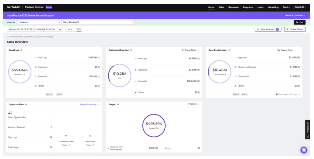 Conçue pour faciliter le quotidien des partenaires, la console Nutanix Partner Central propose des tableaux de bord intuitifs permettant de suivre les ventes, les remises et les opportunités, tout en disposant d’une vision complète des métriques propres au programme Partenaires Elevate. Cette centralisation demandée par le channel qui doit gérer différents programmes de différents fournisseurs permet entre d’autres d’identifier rapidement de nouvelles perspectives de croissance.