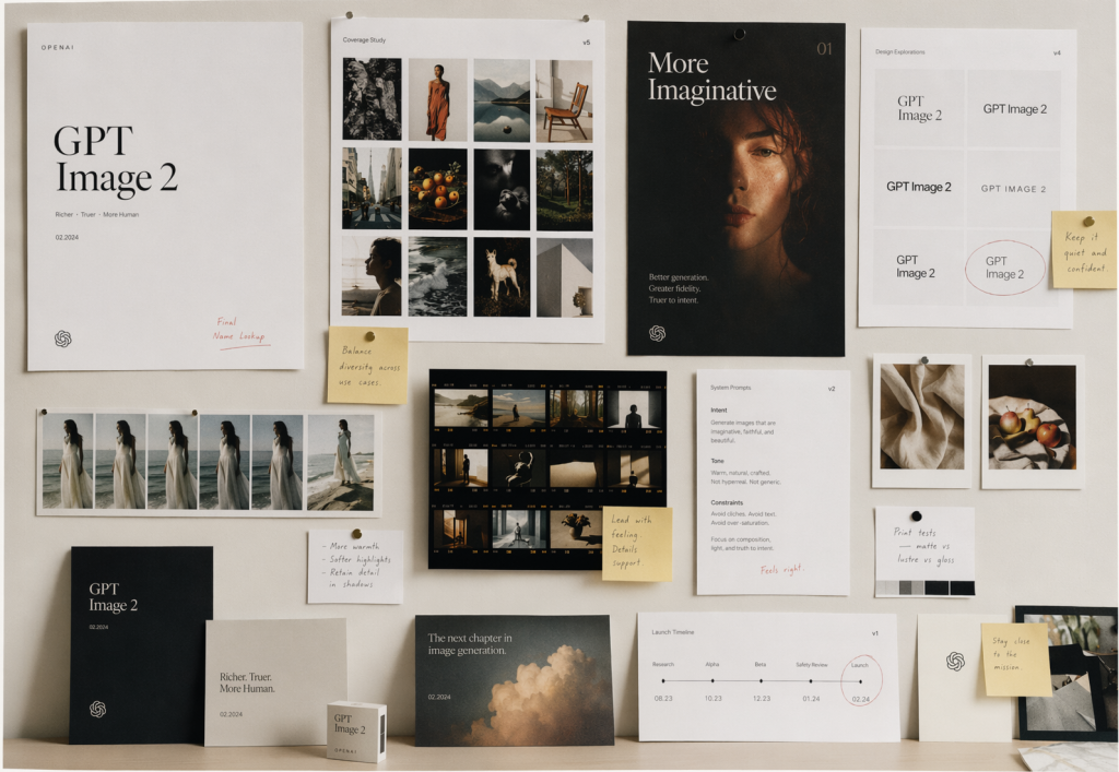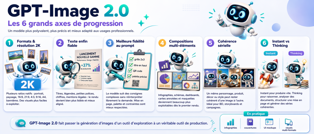 Images 2.0 supporte des ratios de 3:1 (ultra-large) à 1:3 (ultra-haut), couvrant bannières web, slides de présentation, posters, écrans mobiles, marque-pages et graphiques sociaux. Objectif explicite d’OpenAI : réduire la post-production (et le recours à Photoshop pour corriger ou recadrer) et produire des actifs directement utilisables dans la chaîne de diffusion.
