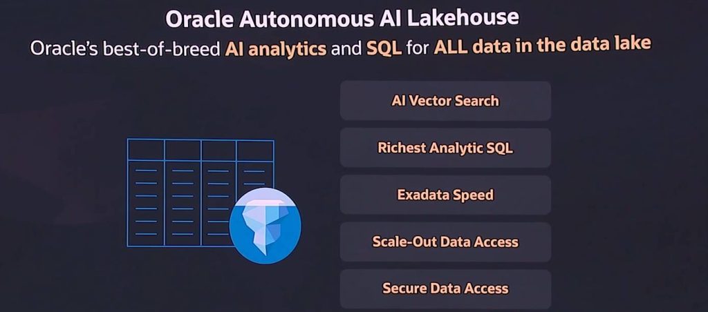 Cette « IA au cœur » se prolonge dans Autonomous AI Lakehouse. Cette plateforme est la réponse d’Oracle au besoin de combiner la flexibilité des lacs de données à Autonomous AI Database et au casse-tête actuel engendré par la multiplication des lacs hétérogènes, des catalogues, des copies de données, avec au final des équipes qui passent plus de temps à déplacer des datasets qu’à produire de la valeur. Concrètement, Oracle marie sa base Autonomous AI Database avec le standard Apache Iceberg pour que l’IA et l’analytique puissent travailler directement sur vos tables Iceberg, sans migrer les données. Avec l’idée de rendre plus « plug-and-play » l’accès aux données où qu’elles résident (sur OCI, AWS, Azure, Google Cloud ou Exadata Cloud@Customer) en s’appuyant sur la même couche de sécurité, de performance et de gouvernance. Le support d’Apache Iceberg permet à l’AI Lakehouse d’interroger et d’analyser des données qui résident dans des environnements multicloud sans avoir à effectuer de coûteux et lents processus de déplacement de données (ETL). La plateforme se branche aux catalogues existants (Databricks Unity, AWS Glue, Snowflake Polaris) et unifie la gouvernance via un « catalogue des catalogues » (Autonomous AI Database Catalog).