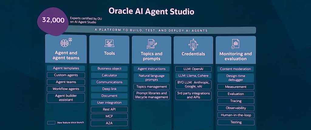Ainsi, AI Agent Studio prend du galon. Présenté comme un outil low-code/no-code, l’AI Agent Studio est conçu pour permettre aux clients et aux partenaires de construire, tester et déployer leurs propres agents IA personnalisés. Cette plateforme vise à démocratiser le développement de l’IA, en donnant aux experts métier, et pas seulement aux data scientists, les moyens de créer des automatisations intelligentes adaptées à leurs besoins spécifiques. À AI World 2025, Oracle a dévoilé une évolution majeure de son AI Agent Studion afin de prendre en charge une large gamme de LLM, y compris ceux de fournisseurs tiers comme OpenAI, Google, Meta et Anthropic, offrant une flexibilité maximale.