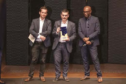 Remise du Trophée DSI catégorie Impact social, sociétal et développement durable à JEAN-NOËL OLIVIER, directeur général du numérique des systèmes d’information, Bordeaux Métropole, par Charly Vanhaecke, ChromeOS specialist, ChromeOS (à gauche) et Chanfi Maoulida, chief digital officer, Service de santé des Armées (à droite).