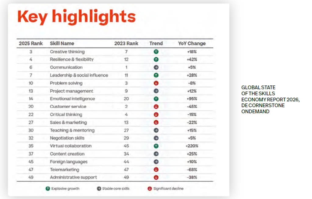 Ce rééquilibrage est le principal enseignement tiré du rapport annuel Global State of the Skills Economy Report de Cornerstone OnDemand. Pour établir le classement des compétences les plus demandées en 2026, l’éditeur de solutions RH a analysé plus de 28 To de données compilant des offres d’emploi, des CV, des données publiques, des parcours de formation ou des rapports d’entreprises. En tout, plus de 50 000 compétences ont été passées au crible dans différents secteurs, fonctions et pays.