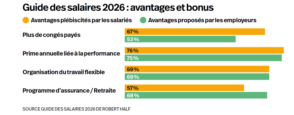 Dans ce climat hivernal, la surenchère salariale n’est plus de mise et les recruteurs misent sur de nouveaux éléments pour attirer les talents. Selon le Guide des salaires 2026 du cabinet Robert Half, 95 % des salariés estiment ainsi que différents avantages sociaux peuvent compenser un écart salarial. Dans leur package idéal, ils plébiscitent une prime annuelle liée à la performance (76 %), davantage de congés payés (67 %), une organisation du travail flexible intégrant du télétravail et/ou des journées à horaires réduits (69 %) et un programme d’assurance retraite compétitif (57 %).