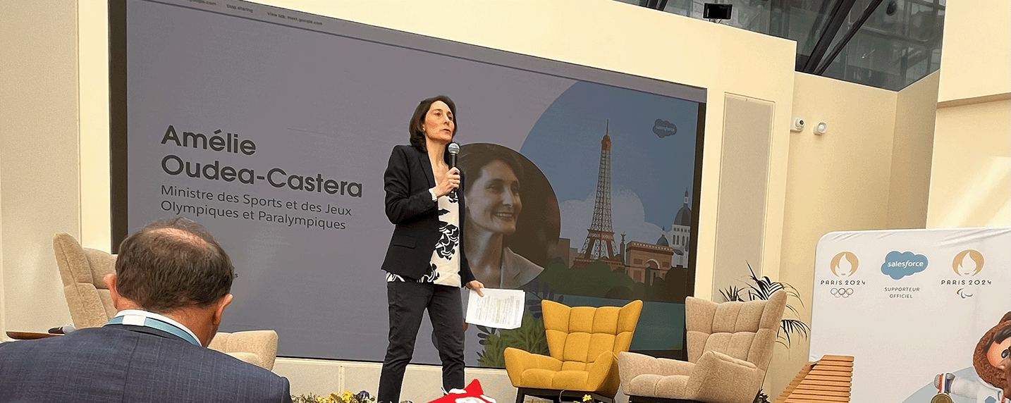 Qu’ont en commun Ysaora Thibus, Erwan Konaté, Emmanuelle Mörch, Sofyane Mehiaoui et Daniel Narcisse ? S’ils sont ou ont été tous athlètes de haut niveau dans leurs disciplines respectives (fleuret, saut en longueur, tennis fauteuil, basket-ball, fauteuil et handball), tous les cinq sont devenus les « ambassadeurs de marque du programme Athletes in Tech » de Salesforce. Un programme qui ambitionne de les accompagner pendant leur carrière sportive et de les préparer pour leur « deuxième vie », comme l’a souligné Amélie Oudéa-Castéra, ministre des Sports et des Jeux olympiques et paralympiques, venue saluer cette initiative.