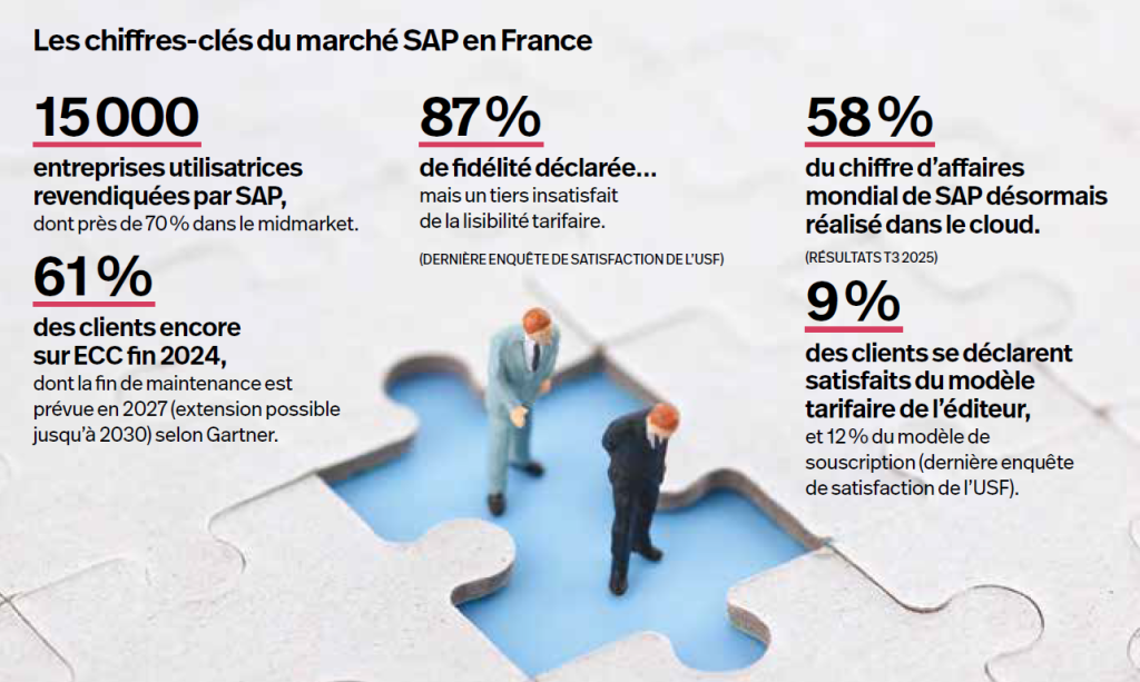 Pour des clients ravis ? Ont-ils seulement le choix, au vu de l’importance prise par les solutions de l’éditeur allemand dans leur SI et leur fonctionnement (voir ci-contre) ? Sans doute pas. Et cette situation les porte à la prudence. À Lyon, début octobre, lors de la convention annuelle de l’USF, les confidences n’avaient lieu qu’à voix basse.