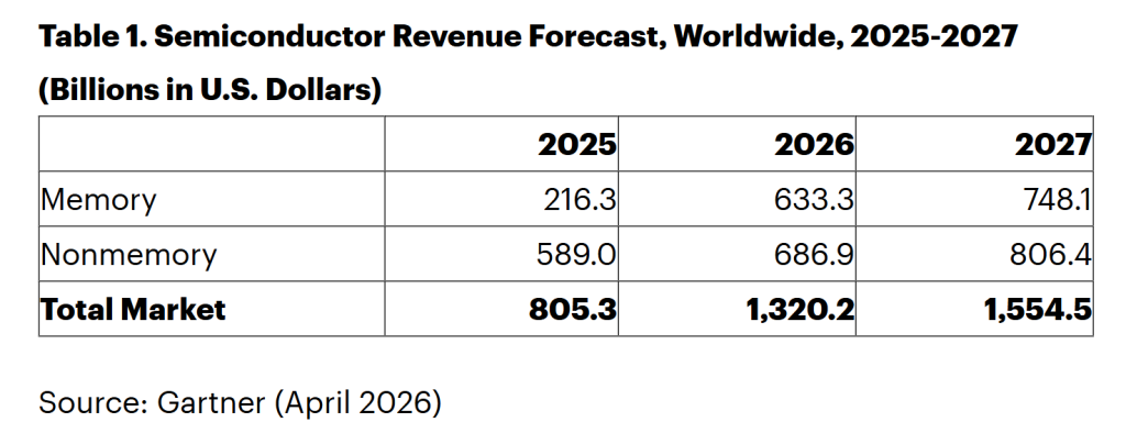 Le tableau publié par Gartner est édifiant. Les revenus issus de la mémoire passeraient de 216,3 milliards de dollars en 2025 à 633,3 milliards en 2026, soit un quasi-triplement en douze mois !