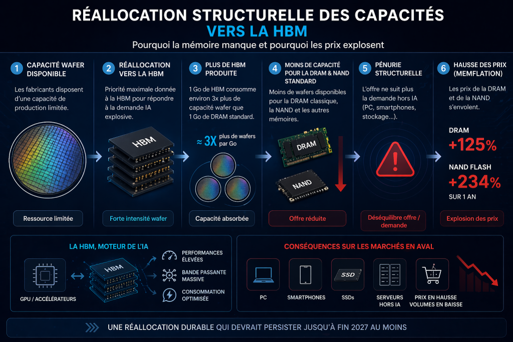 L’industrie de la mémoire était traditionnellement cyclique, rythmée par les ventes de PC et de smartphones. Ce cycle est mort en 2024. À sa place s’est imposée une logique radicalement différente, qu’IDC qualifie de « réallocation structurelle, potentiellement permanente, des capacités wafer mondiales ». Les fabricants ont massivement réorienté leurs cleanrooms vers la HBM (High Bandwidth Memory), cette mémoire haute performance empilée en 3D qui équipe tous les GPU d’IA de NVIDIA et les accélérateurs custom des hyperscalers.