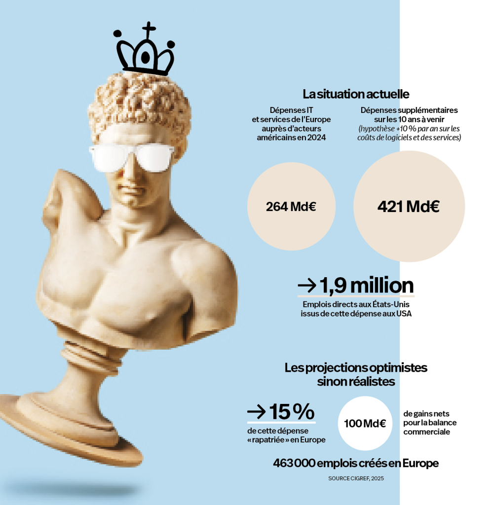 C’est bien cette dépendance qui est aujourd’hui sur la sellette dans les Comex et les DSI, au-delà d’autres considérations géopolitiques qui relèvent des gouvernements et de la Commission européenne. Car cet asservissement coûte très cher. Le Cigref s’est livré en janvier dernier à une estimation (voir page précédente) : 264 Md€ de dépenses de logiciels et de services partent chaque année outre-Atlantique, et quelque deux millions d’emplois.