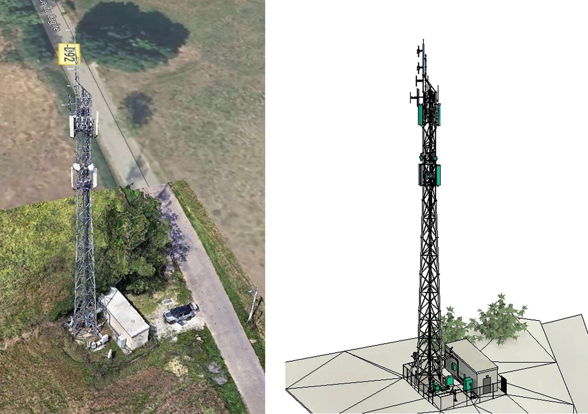 Ces prises de vues servent ensuite à reconstruire le modèle 3D de la structure, identique à la vision humaine, avec sa forme, ses dimensions, sa localisation. Cette technique de photogrammétrie a fait ses preuves. « L’idée est d’obtenir une vue de type Google Street du toit-terrasse ou du pylône », image Mouaad Aabibou. Surtout, ce modèle accessible en visite virtuelle donne l’accès à des données utiles pour préparer une installation (environnement autour de l’infrastructure, vue du pylône par le dessus, boulonnerie associée…).