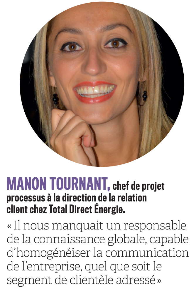 Chez Total Direct Énergie, l’organisation repose sur deux équipes projet : une pour les particuliers et l’autre sur le segment des entreprises. Chaque équipe comprend trois chefs de projet, chargés de rédiger les procédures et de mettre à jour la base de connaissance. « L’outil est réellement très pratique, explique Manon Tournant, car il permet de constituer des bibliothèques d’objets (discours, images, etc.) que l’on peut réutiliser à chaque nouvelle rédaction de procédure, ce qui nous fait gagner un temps considérable. Au passage, ces bibliothèques contribuent également à l’homogénéisation de notre politique de communication puisque tous les contributeurs utilisent les mêmes objets ».