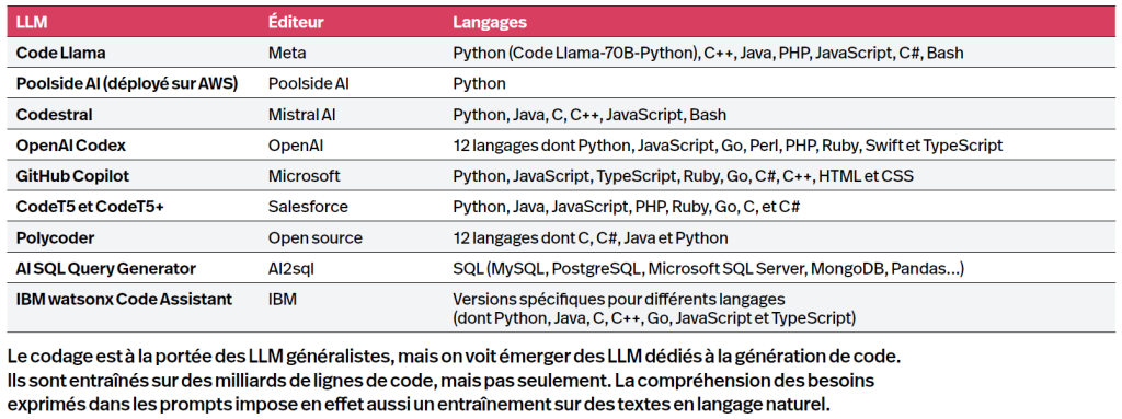 Lorsque l’on pense à l’impact des LLM sur le métier de développeur, on évoque d’abord leur capacité à générer du code dans de multiples langages (voir tableau). Mais leur impact est appelé à être bien plus large. Il concerne potentiellement l’ensemble du cycle de vie des applications : expression des besoins, codage, documentation d’un code existant, explication de ses fonctionnalités, tests et maintenance.