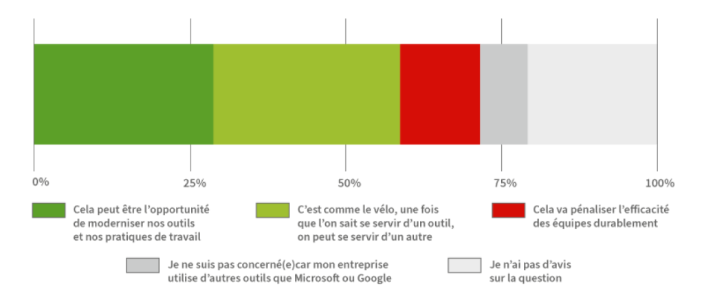 Autre indice intéressant, les réfractaires au changement d’environnement ne sont pas majoritaires. Il y a donc de l’espace pour une sortie progressive en débutant avec les collaborateurs les plus souples et les plus ouverts ou engagés et en combinant les solutions US avec les Digital Workplace françaises ou européennes.