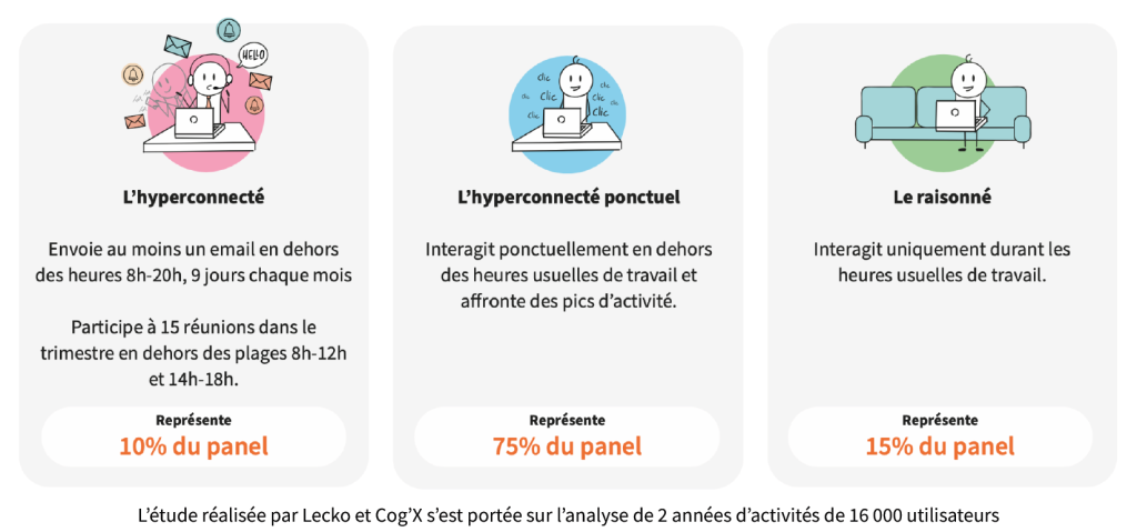 L’étude objectivise cette dérive avec des indicateurs d’usage. L’hyperconnexion est caractérisée par des échanges hors plage 8h-20h un jour sur deux. En moyenne, 10 % des collaborateurs et 40 % des cadres travaillent ainsi un jour sur deux « en débordement » (en dehors de la plage 8H-20H). Plus largement, 75 % des salariés connaissent plusieurs semaines d’hyperconnexion par an.