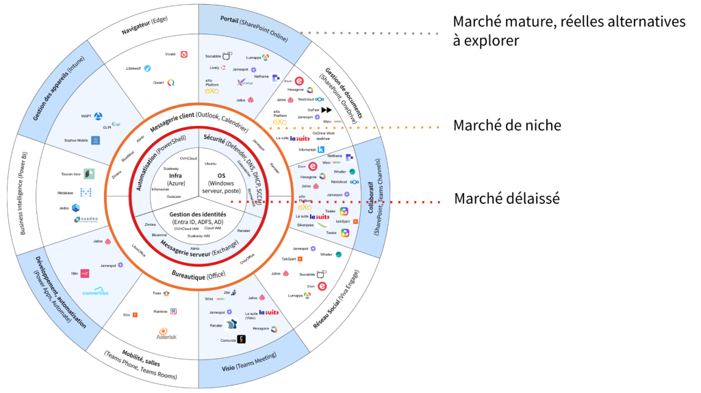L’une des illustrations (reproduite ci-dessous) les plus parlantes de l’étude Lecko montre à quel point lorsque l’on a la volonté de sortir des bundles américains et d’adopter des voies alternatives il existe une multitude de solutions françaises ou européennes. Aucun pan de la Digital Workplace n’est pas couvert par des alternatives européennes et/ou open source.