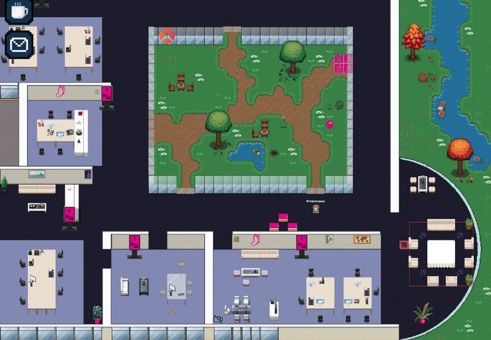Les espaces virtuels de Veepee Quest mixent salles de réunion et zones d’échanges informels (jardin, cafétaria, salon, etc.). Dans ces dernières, les utilisateurs peuvent discuter à deux voire trois personnes, par visioconférence ou messagerie instantanée.