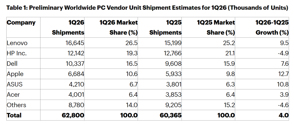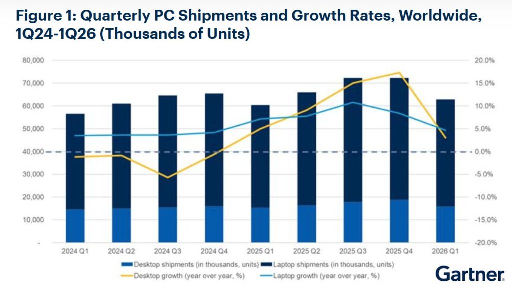 « La croissance des livraisons PC au premier trimestre 2026 a été artificiellement gonflée », résume sans détour Rishi Padhi, Research Principal chez Gartner. « Elle n’est pas liée à une demande réelle, mais à la hausse des niveaux de stocks en anticipation des hausses de prix attendues au Q2, portées par une inflation rapide des prix mémoire – la « memflation » – et des composants DRAM et NAND flash. Ce phénomène est particulièrement visible sur les produits à faible marge. »