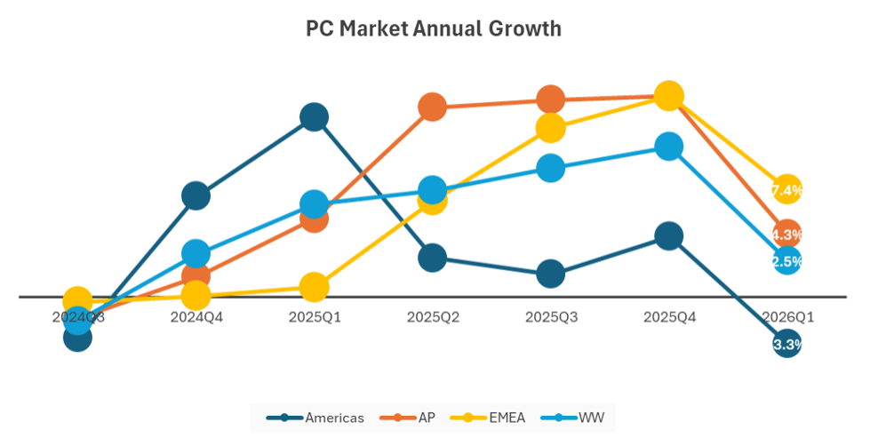 Pas étonnant, dès lors, de voir tous ces analystes anticiper un repli progressif des livraisons au fil de 2026 à mesure que les prix des systèmes grimperont. Les signaux régionaux ne sont guère plus encourageants : en Amérique du Nord, les distributeurs ont déjà absorbé tout ce qu’ils pouvaient en amont de la hausse des prix finaux, ce qui nous promet un Q2 atone. Au Japon, le marché recule déjà nettement, plombé par une base de comparaison 1Q25 très élevée et par des tensions particulièrement aiguës sur le segment éducation.